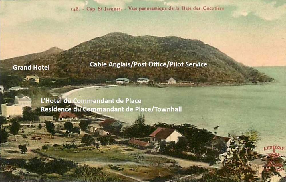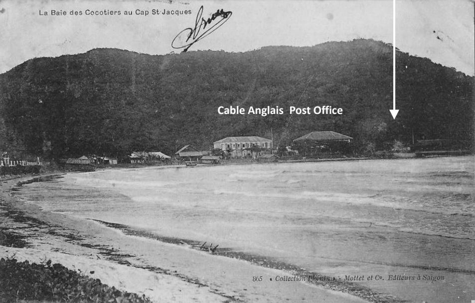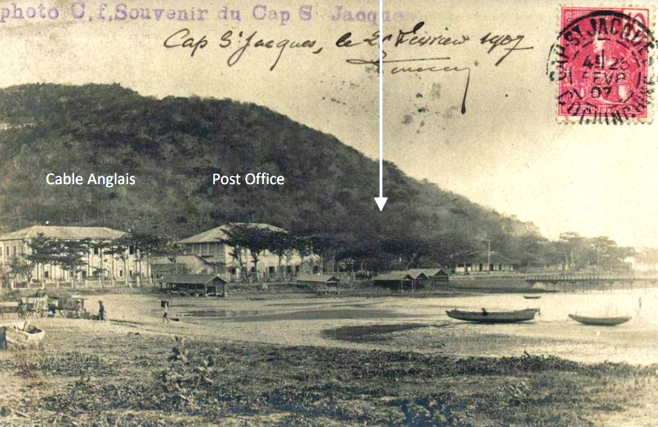 The Cable Anglais/English Telegraph was laid into Cap St Jacques in the very early twentieth century (most likely in 1901) by La Société Industrielle des Téléphones (SIT)/The Industrial Telephone Company using the cable laying ship CS Francois Arago. The Cap St Jacques Cable Anglais building was built around the same time and originally it had a simple hipped roof but, by the 1930s had acquired a higher and steeper(?) roof with mini gable ends at the apex.