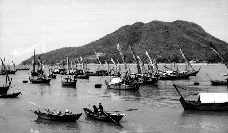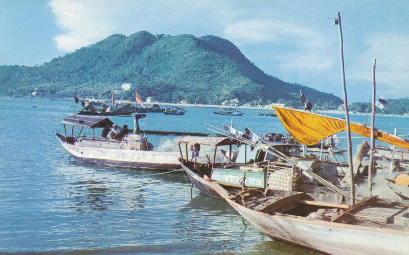 Construite entre les deux collines dites Petit Massif, au Sud et Grand Massif, au Nord, la ville du Cap Saint-Jacques borde sur plus d'un kilomètre la Plage d'un Cocotiers (réputée pour l'absence presque totale de cocotiers...) et s'étale en profondeur jusque vers la Pointe de Tiouan. Dans le petit port, à l'abri de la colline vert jade sur laquelle se dresse le phare, écrivait naguère sous le pseudodonyme de Yann un auteur doublé d'un poète, des sampans de pêche dorment paisiblement. Leur galbe racé invite aux courses océanes ; tous portent l'œil protecteur qui doit éloigner les génies malfaisants. Plus loin, à l'ancre, des saumuriers se balancent doucement. Leurs voiles roulées autour de la mâture brune se dressent sur le ciel azuré. Jonques de haute mer chargées de précieux "nuoc mam", elles transportent leur produit épi cé des terres rouges de Phan-Thiet vers la grouillante agglomération de Saïgon-Cholon.